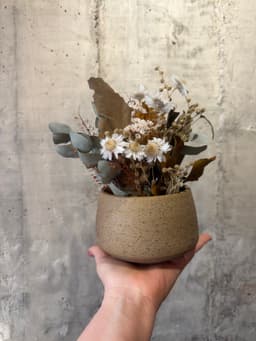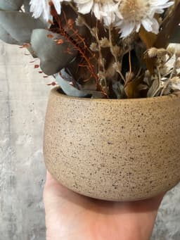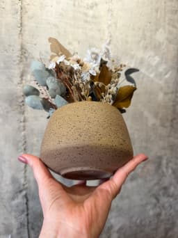 Vaso natural, sem esmalte, que evidencia a argila e o chamote. A textura é levemente áspera ao toque, com pontos visíveis distribuídos ao longo de toda a peça. O acabamento valoriza o material em seu estado cru, sem interferência de brilho. A cor é uniforme, em tom terroso claro. A forma é simples e arredondada, com base estável e abertura ampla, permitindo composições mais cheias de flores.