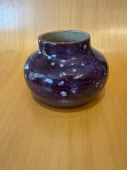Vaso na cor roxo malbec, com esmalte reativo que forma pontos claros distribuídos de maneira irregular ao longo da peça. A superfície é brilhante, com variações de intensidade que acompanham o volume. A forma é arredondada, com base mais larga e leve fechamento na abertura. O interior recebe esmalte transparente e expõe a cor natural da argila.